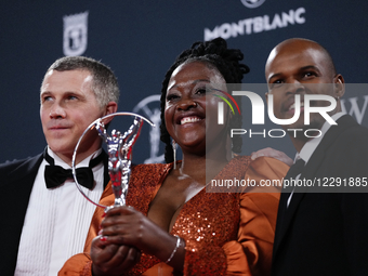Motlatsi Nkhahle, Puky Ramokoatsi and Steve Fleming with the Laureus World Sport for Good Award award of Kick4Life attend the Winners Walk during the 2025 Laureus World Sport Awards winners walk at Palacio De Cibeles on April 21, 2025 in Madrid, Spain.