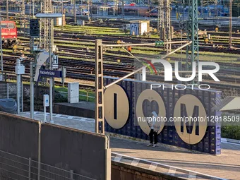 A young man uses a smartphone while standing on the platform at Hackerbrucke station in Munich, Bavaria, Germany, on October 1, 2025. He texts near the ''I love M'' sign with train tracks in the background.