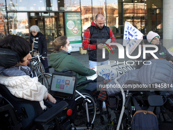 Handicapped people protest in front of the Purpan teaching hospital in Toulouse, France, on January 14, 2025. The NGO Handi'social calls for a gathering in front of the Purpan teaching hospital to protest against the only choice left to Karine Brailly: to live an undignified life or die. Karine Brailly, an artist, has Amyotrophic Lateral Sclerosis, also called Charcot's disease. As her end is near, she asks to return to her house with a helper she chooses, but doctors refuse and tell her to accept a helper from Vitalliance, which has a record of mistreatment towards handicapped people. Doctors also refuse to treat her with an experimental treatment. Moreover, doctors accept a deep sedation for her at her request for this day, but in the morning, they say it is not possible at this moment. Protesters and handicapped people present demand that France respect the UN Convention on the Rights of Persons with Disabilities. The French National Assembly is poised to look at a new law called the 'law on the end of life' this month.