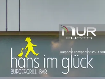 The logo of the German fast food franchise Hans im Glueck is seen in the Munich pedestrian zone.