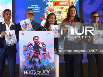 Indian sports persons Anju Bobby George, Dola Banerjee, Mehtab Hussain, and Joydeep Karmakar attend the launch of the coffee table book of the JBG Kolkata Marathon 2025 in Kolkata, India, on November 9, 2025.