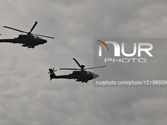 In Athens, Greece, on March 25, 2025, a pair of Boeing AH-64 Apache helicopters of the Hellenic Air Force make a flyover over Athens to honor Greece's Independence Day on March 25.