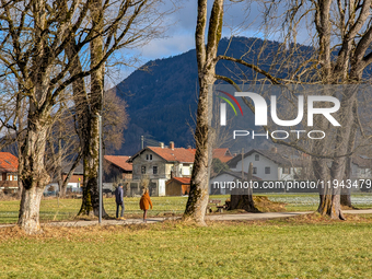 In Benediktbeuern, Bad Toelz-Wolfratshausen, Upper Bavaria, Bavaria, Germany, on January 11, 2025, a rural village scene features two people walking along a paved path surrounded by tall, leafless trees. Traditional Bavarian houses with red-tiled roofs are visible in the background, along with a mountainous landscape. The foreground shows grassy fields and a tree stump.