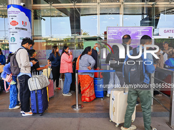 Passengers stand in a queue for security checks amid widespread flight delays and cancellations at Jaipur International Airport in Rajasthan, India, on December 6, 2025. IndiGo's operations are severely disrupted across the country due to crew shortages following new duty-rest regulations.