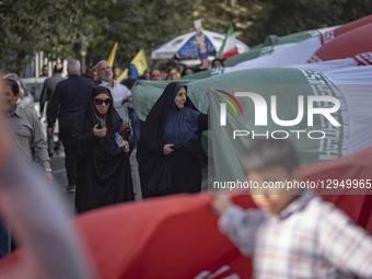 Iranian protesters hold a giant country flag while participating in an anti-American and anti-Israeli rally marking the anniversary of the U.S. embassy takeover in downtown Tehran, Iran, on November 4, 2025. About 100 Muslim students seize the U.S. Embassy in Tehran on November 4, 1979, protesting American interference and demanding the Shah's extradition. Backed by Ayatollah Khomeini, the hostage crisis triggers Iran-U.S. diplomatic rupture, economic sanctions, and Prime Minister Bazargan's resignation.