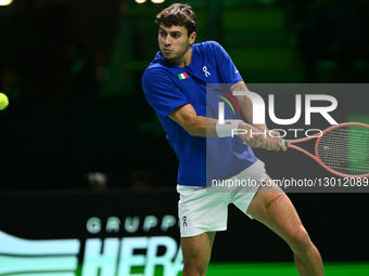 Matteo Berrettini of Italy plays during the Davis Cup Semi-Final match against Raphael Collignon of Belgium at Supertennis Arena - Bolognafiere in Bologna, Italy, on November 21, 2025