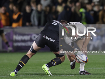 Jamie Hodgson of Newcastle Red Bulls tackles Owen Farrell of Saracens during the Gallagher Prem Rugby match between Newcastle Red Bulls and Saracens at Kingston Park in Newcastle, United Kingdom, on September 26, 2025.