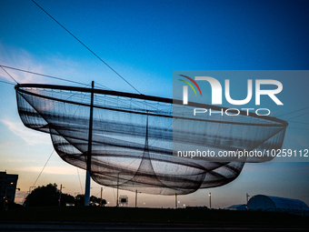 A view of the monumental public sculpture ''She Changes'' by Janet Echelman while walking the Portuguese Camino Coastal Route, on June 2023.