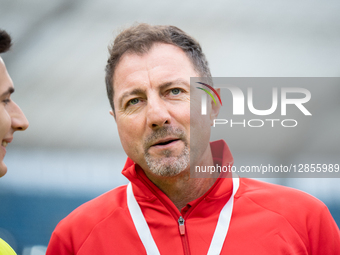 Lukas Podolski, Jerzy Dudek, and Tomasz Klos are seen during the Legendy na Slaskim, a friendly football match between legends of Poland and Germany in Chorzow, Poland, on October 12, 2025. The exhibition game at Silesian Stadium features former players from both national teams.