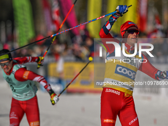 CANMORE, CANADA - FEBRUARY 9: Harald Oestberg Amundsen (C) of Norway lsprints to take the 2nd place in Men's 15km Mass Start Free at the COOP FIS Cross Country World Cup, on February 9, 2024, in Canmore, Alberta, Canada,