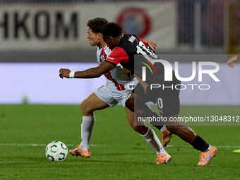 Andre Tjay De Barr of Lincoln Red Imps plays against Joseph Mbong of Hamrun Spartans during the UEFA Conference League league phase match between Hamrun Spartans FC and Lincoln Red Imps FC at the National Stadium in Ta' Qali, Malta, on November 27, 2025.