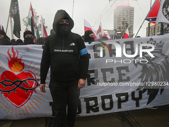 WARSAW, POLAND - NOVEMBER 11, 2025: Participants, including groups associated with far-right movements from Poland and several European countries, march during the Independence March marking the 107th anniversary of Poland's return to sovereignty, in Warsaw, Poland, on November 11, 2025. Thousands gathered in the capital to commemorate National Independence Day.