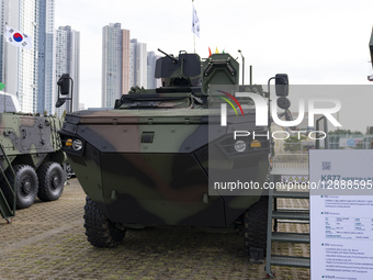 The K877 wheeled command post vehicle is on display during the Seoul International Aerospace and Defense Exhibition (ADEX 2025) at KINTEX in Ilsan, Goyang, South Korea, on October 20, 2025.