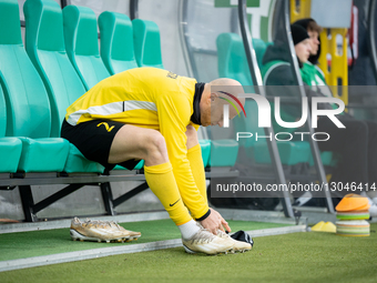Goalkeeper Kamil Soberka warms up before the game between Wieczysta Krakow and Slask Wroclaw in Sosnowiec, Poland, on November 30, 2025. This is a Betclic 1 Liga, Polish football first league match at ArcelorMittal Park Stadium, Zaglebiowski Park Sportowy.