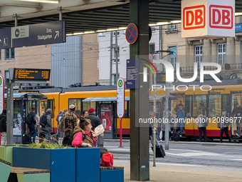 A busy tram stop is at the central station in Karlsruhe, Baden-Wurttemberg, Germany, on February 24, 2025. Passengers board and disembark from a yellow tram, which is part of the city's public transportation network. Overhead, signage from Deutsche Bahn, DB, indicates the main train station. Digital displays show tram and train schedules, and people are with luggage and backpacks. Directional signs point towards the city zoo and other destinations.