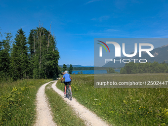 A cyclist rides along the lakeside trail near Lake Barmsee in Klais, Kruen, Garmisch-Partenkirchen, Bavaria, Upper Bavaria, Germany, on June 22, 2025. The route offers scenic views of the Karwendel mountains and is a popular destination for outdoor activities in the region.