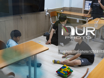 Instructors teach children as part of an educational program at Hope365, a support center for overseas Koreans, in Ansan, South Korea, on July 16, 2025. Hope365, one of 23 centers nationwide, offers free services to help overseas Koreans settle in South Korea, including academic education in 18 languages, cultural training, and guidance on local norms and customs. The center also provides free shelter and meals for those in need and offers customized programs tailored to individuals' reasons for coming to Korea, such as employment or study.