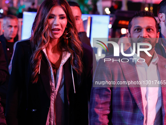 Kristi Noem and Kash Patel are in the paddock of the Formula 1 Heineken Las Vegas Grand Prix in Las Vegas, Nevada, on November 22, 2025.