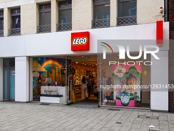 A LEGO store on a shopping street in Duesseldorf, North Rhine-Westphalia, Germany, on July 30, 2025, displays colorful LEGO-themed window decorations and showcases various sets and creations inside the retail space. People pass by.