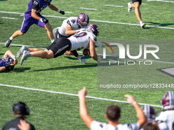 On October 4, 2025, in Whitewater, Wisconsin, USA, University of Wisconsin-La Crosse Eagles defensive lineman Thomas Laufenberg (90) recovers a fumble during a college football game between the University of Wisconsin-Whitewater Warhawks and the University of Wisconsin-La Crosse Eagles at Perkins Stadium.