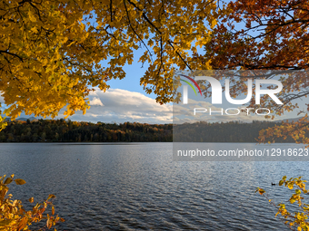 A wide view of Lake Staffelsee is framed by trees displaying brilliant golden autumn foliage, showing ducks on the water and a classic boathouse or lakeside building against the backdrop of mountains and forests in Murnau am Staffelsee, Upper Bavaria, Bavaria, Germany, on October 24, 2025.
