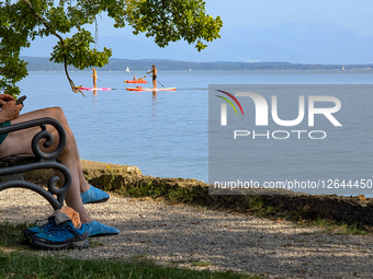 A man sits on a bench using a smartphone near the shore of Lake Starnberg, with people paddleboarding in the background, in Tutzing, Starnberg, Upper Bavaria, Bavaria, Germany, on August 14, 2025.
