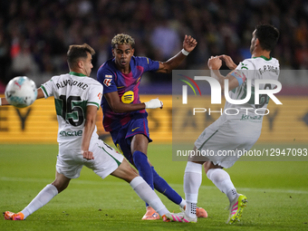 Lamine Yamal right winger of Barcelona and Spain shooting to goal during the La Liga EA Sports match between FC Barcelona and Elche CF at Estadi Olimpic Lluis Companys on November 2, 2025 in Barcelona, Spain.