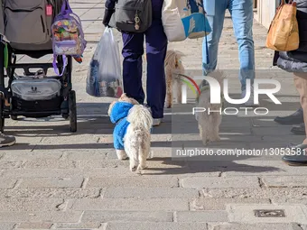 Shoppers and pedestrians walk three small dogs and carry shopping bags on the paved quay of Murano Island in Murano, Venice Province, Veneto, Italy, on November 18, 2025. The scene captures consumption and trade, highlighting the local economy and daily life on Murano Island.