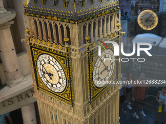 The public contemplates the 6-meter-high reproduction of Big Ben inside the Lego store in London, England. It features numerous large figures built with the famous blocks of this brand.