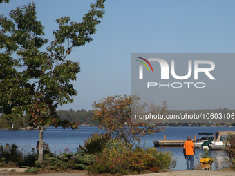 Man and his dog walking along a lake in Muskoka, Ontario, Canada, on September 29, 2023.