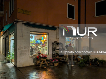 A florist wearing a hat and light jacket walks past the exterior display of a flower shop, which illuminates the wet, reflective stone pavement at night in Venice, Italy, on November 15, 2025. The corner building features a sign pointing toward Rialto and San Marco, and the shop is filled with brightly colored flowers and potted plants.