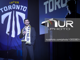 In Toronto, Ontario, Canada, on November 27, 2025, Inter Toronto head coach Mauro Eustaquio gives a statement during the Inter Toronto Football Club launching event at The Great Hall.