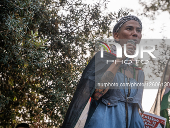 Dozens of people gather in Plaza Catalunya in solidarity with Palestine and activist Mi Hoa Lee, a Barcelona resident and activist who begins a public hunger strike as part of the ''Empty Stomach Movement,'' in Barcelona, Spain, on August 1, 2025.