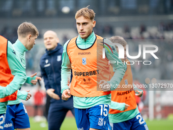 Michal Gurgul warms up before the game between KS Cracovia and Lech Poznan in Krakow, Poland, on December 7, 2025. The PKO BP Ekstraklasa, Polish football league match, takes place at Cracovia Stadium.
