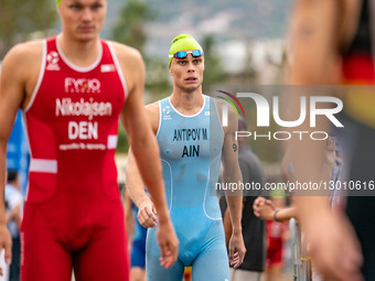 Mikhail Antipov of AIN competes in the Elite Men's race at the 2025 Europe Triathlon Cup Alanya in Antalya, Turkiye, on October 25, 2025.
