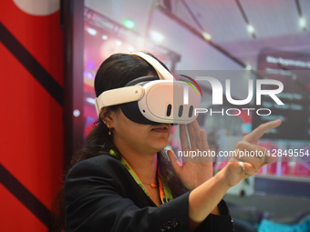 A woman uses a Virtual Reality (VR) headset at the India Mobile Congress 2025 in Delhi, India, on October 11, 2025.