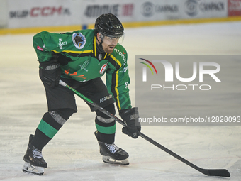 KRAKOW, POLAND – OCTOBER 3: Damian Kapa of Cracovia is seen in action challenged by Patryk Hanzel of GKS Jastrzebie during the 8th-round Tauron Hockey League match between Comarch Cracovia and JKH GKS Jastrzebie, in Krakow, Poland, on October 3, 2025.