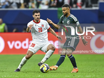 Ali Majrashi of Saudi Arabia and Mohannad Abutaha of Jordan are in action during the FIFA Arab Cup 2025 Semi-final match between Saudi Arabia and Jordan at Al Bayt Stadium in Doha, Qatar, on December 15, 2025.