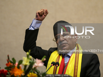 Former Nepali Prime Minister and Coordinator of the Communist Party of Nepal, Pushpa Kamal Dahal, also known as Prachanda, gestures during a party unification event in Kathmandu, Nepal, on November 27, 2025. Pro-unification factions from four more parties merge with the Nepali Communist Party, which forms on November 5. The latest round of mergers between the communist parties of Nepal includes the Janata Samajwadi Party's pro-unification faction led by Federal Council Chairman Rajendra Shrestha, the Janajagaran Party Nepal, the rebel group of the CPN (Majority), and the rebel group of the CPN (Maoist). The unification announcement ceremony is attended by Nepali Communist Party Coordinator Pushpa Kamal Dahal, Co-coordinator Madhav Kumar Nepal, leaders Jhala Nath Khanal, Bamdev Gautam, Narayan Kaji Shrestha, Ganga Narayan Tuladhar, and others. Rajendra Shrestha and other leaders from the groups taking part in the merger are also present at the event. Ten groups, including the CPN (Maoist Center) and CPN (Unified Socialist), announce their unification to form the Nepali Communist Party on November 5. Later, two more parties, including the one led by Bhim Rawal, also join the newly-formed party. With the addition of the groups joining on Thursday, the total number of groups merging with the NCP reaches 16.