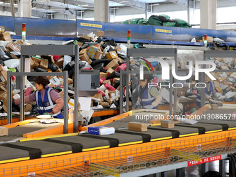 Staff sort parcels at the Network Operations Center of the Postal Division of China Post Zaozhuang Branch in Zaozhuang City, Shandong Province, China, on December 12, 2025.