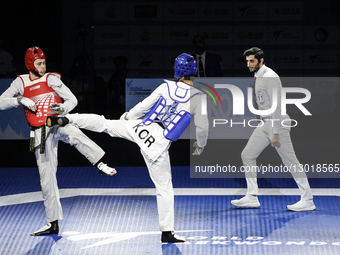 Nikta Kriuchkovain of Athletes Individuels Neutres competes against Woojin Kim of Korea in the Men's 80kg category during the World Taekwondo Grand Prix Challenge 2025 at Indoor Stadium Huamark in Bangkok, Thailand, on November 23, 2025. Woojin Kim of Korea wins a bronze medal in the category.