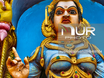 Colourful figures of Hindu deities adorn the Vattappalai Kannakki Amman Temple in Mullaitivu, Sri Lanka. The Vattappalai Kannakki Amman Temple (Vattappalai Kannaki Amman Kovil) is dedicated to Goddess Kannakki Amma. According to Karna legend, Kannaki from Madurai arrived in Sri Lanka and rested in ten different places. The tenth place she visited was Vattappalai. Vattapalai Amman is believed to be a deity of myths, mysteries and miracles. Vaikasi Visakam Pongal Thiruvilla is the main festival, which is held in May.