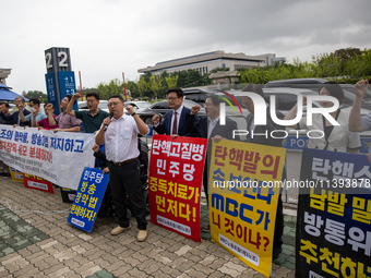 Participants are chanting slogans at a press conference organized by the Joint Struggle Committee to Stop the Broadcasting Law and Normalize MBC, supporting the government and ruling party, in front of the National Assembly in Yeouido on July 9, 2024, in Seoul, South Korea.