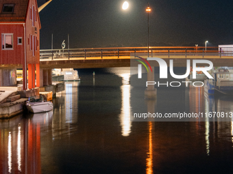 A general view of Fiskebrygga (The Fish Wharf) at night with moon reflecting on sea, in Kristiansand, Norway on September 13, 2024. Fiskebrygga is a former fish landing in the city of Kristiansand in Agder county, Norway. The buildings have been redeveloped as a restaurant, shopping area, and tourist destination.