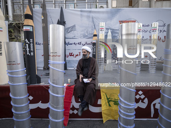 An Iranian cleric sits next to scale models of Iran-made ballistic missiles and centrifuges after participating in an anti-U.S. and anti-Israeli rally marking the anniversary of the U.S. embassy occupation in downtown Tehran, Iran, on November 4, 2025. About 100 Muslim students seize the U.S. Embassy in Tehran on November 4, 1979, protesting American interference and demanding the Shah's extradition. Backed by Ayatollah Khomeini, the hostage crisis triggers Iran-U.S. diplomatic rupture, economic sanctions, and Prime Minister Bazargan's resignation.