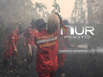 Indonesian firefighters monitor a land fire at Sungai Rambutan Regency in Ogan Ilir, South Sumatera, Indonesia, on July 22, 2025. Hotspots from forest and land fires are detected in the southern part of Sumatra, causing unhealthy air quality levels and hazy skies in the region. The smoke from the fires is expected to cause haze in neighboring countries.