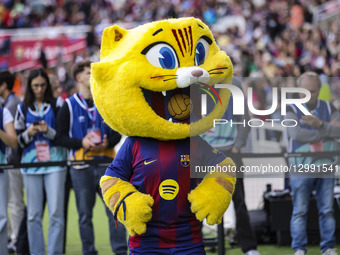 The FC Barcelona mascot is present during the Liga F Moeve match between FC Barcelona Femeni and Real Madrid Femenino at Estadi Olimpic Lluis Companys in Barcelona, Spain, on November 15, 2025.