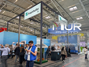 Visitors examine solar research models and photovoltaic technologies at the Fraunhofer ISE and EGING PV booths during Smarter E Europe 2025 in Munich, Bavaria, Upper Bavaria, Germany, on May 7, 2025. The event brings together scientific institutions and leading solar energy companies to showcase the future of sustainable power systems.