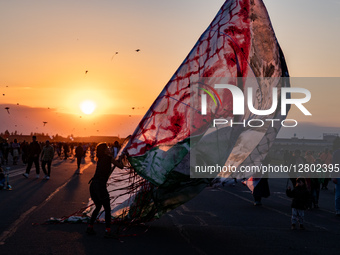 A woman waves a giant Palestine flag at sunset in Tempelhofer Feld park in Berlin, Germany, on September 27, 2025.