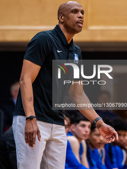 Patrick Sellers, the head coach of the Central Connecticut State Blue Devils, watches during an NCAA men's basketball game at Walsh Gymnasium in South Orange, United States, on December 3, 2025.